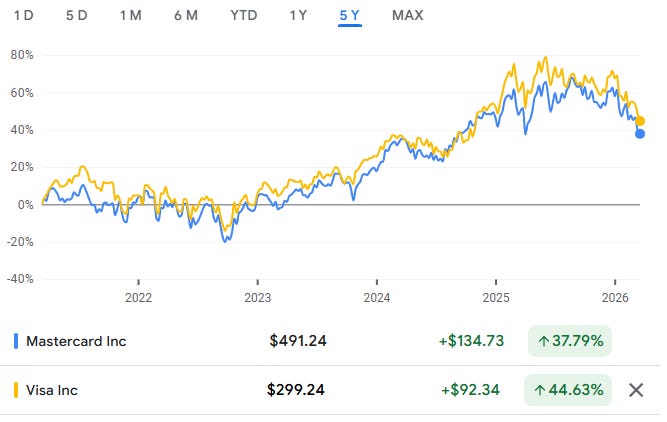 Mastercard is working hard to match Visa's public perception around stablecoins and crypto. Both payment networks have been battling it out to remain the aggregator of aggregators. From a performance perspective, the companies are neck and neck, effectively representing the entire market for payments: