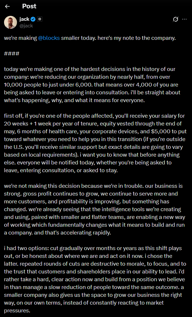 Jack Dorsey’s payments company Block is firing 40% of its workforce, and doing it in the name of AI productivity improvements. While this news has already hit your feed, we can’t help but comment.