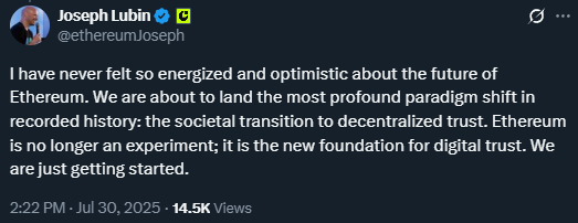You can like it or hate it. But like Bitcoin, Ethereum is special. It has ushered in a way of looking at the world and financial software that opened an enormous door of opportunity. Joe Lubin, an Ethereum co-founder, founder of Consensys, and Chairman of ETH treasury company Sharplink, rang the closing bell at the Nasdaq to celebrate.