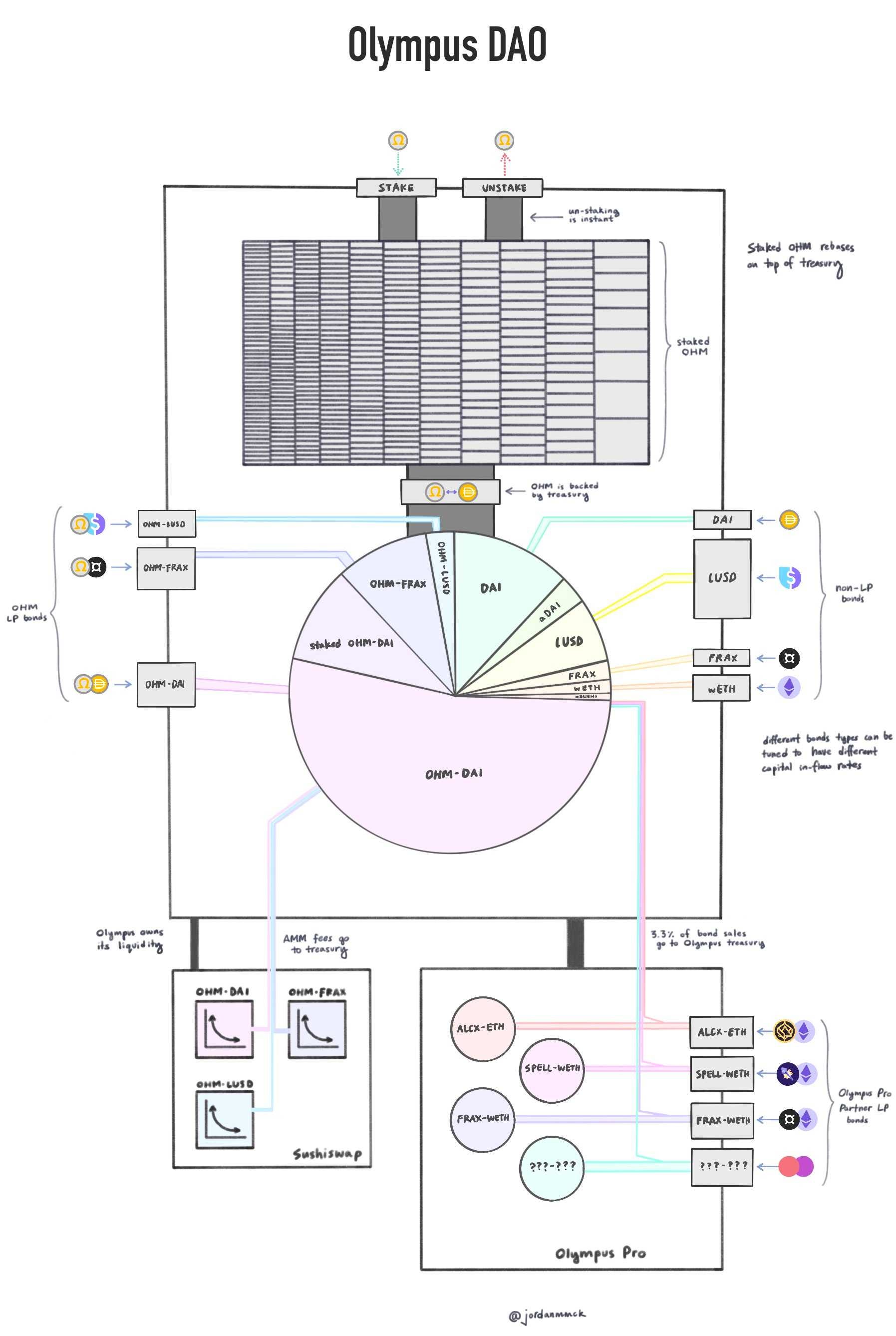No amount of financial structuring, risk shifting, or tokenomics is going to get you to have infinite financial lift-off. Instead, you will have a cycle of aggregation and energy collapse as seen with mortgage-backed securities, or Olympus DAO. When you see diagrams like the ones below, buyer beware.