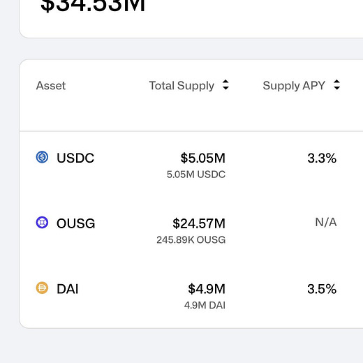 On Flux USDC has a supply APY of 4.3% and a borrow APY of 4.7%, significantly higher than yields offered on DeFi lenders Aave and Compound. The reason for this, we think, is because you would be willing to pay 4.5% to get access to 5.0% returns of the underlying investment instrument. Notably these rates float around with supply and demand for leverage, not necessarily targeting any particular outcome. Further, investors must pass KYC and AML procedures and invest a minimum of $100K to access the capital pools.